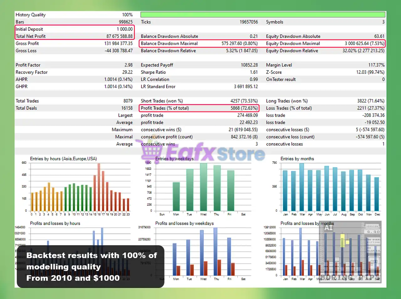 Backtesting of Boring Pips (2010–present) shows outstanding long-term profitability, turning a $1,000 account. With low drawdown, consistently strong profit factor and recovery factor, the EA represents a robust and reliable strategy designed for sustainable growth.