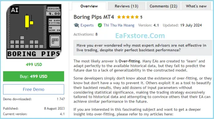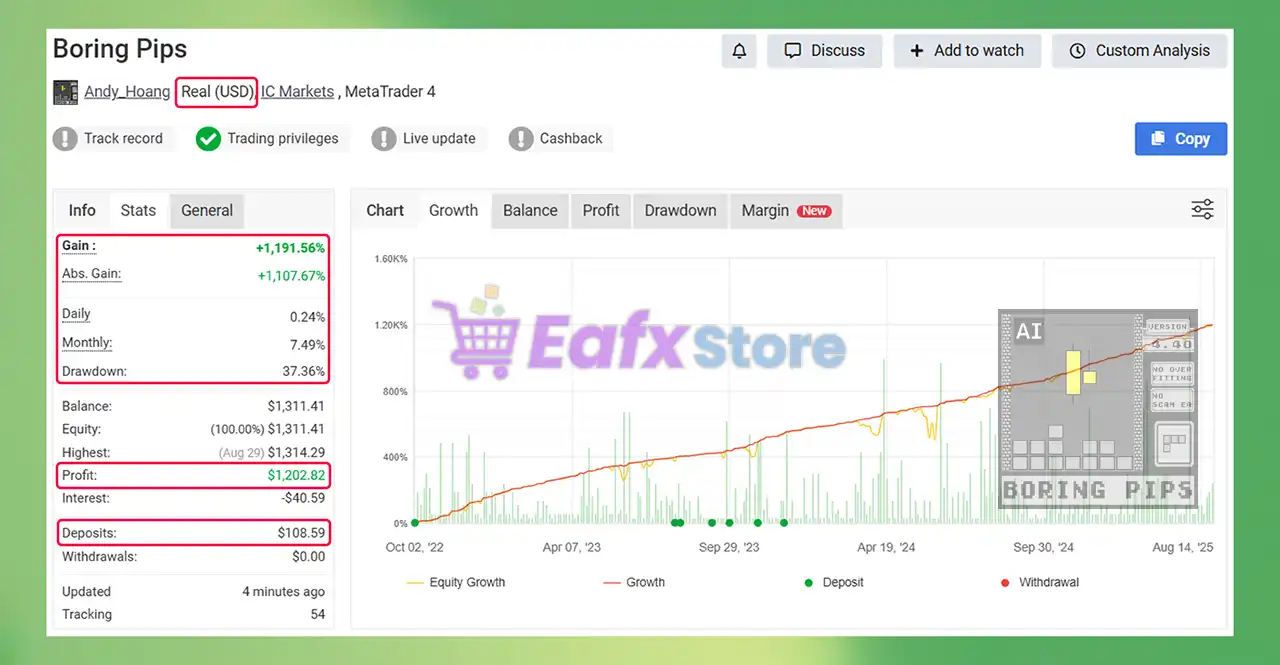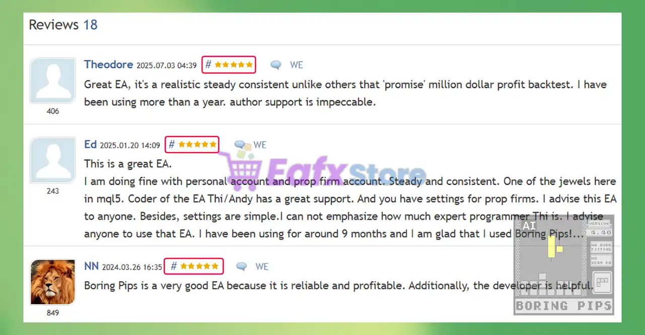 ➡️ NN (2024.03.26): “Boring Pips is a very good EA because it is reliable and profitable. Additionally, the developer is helpful.”