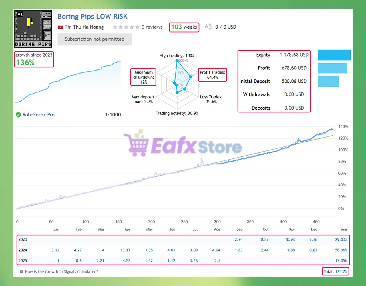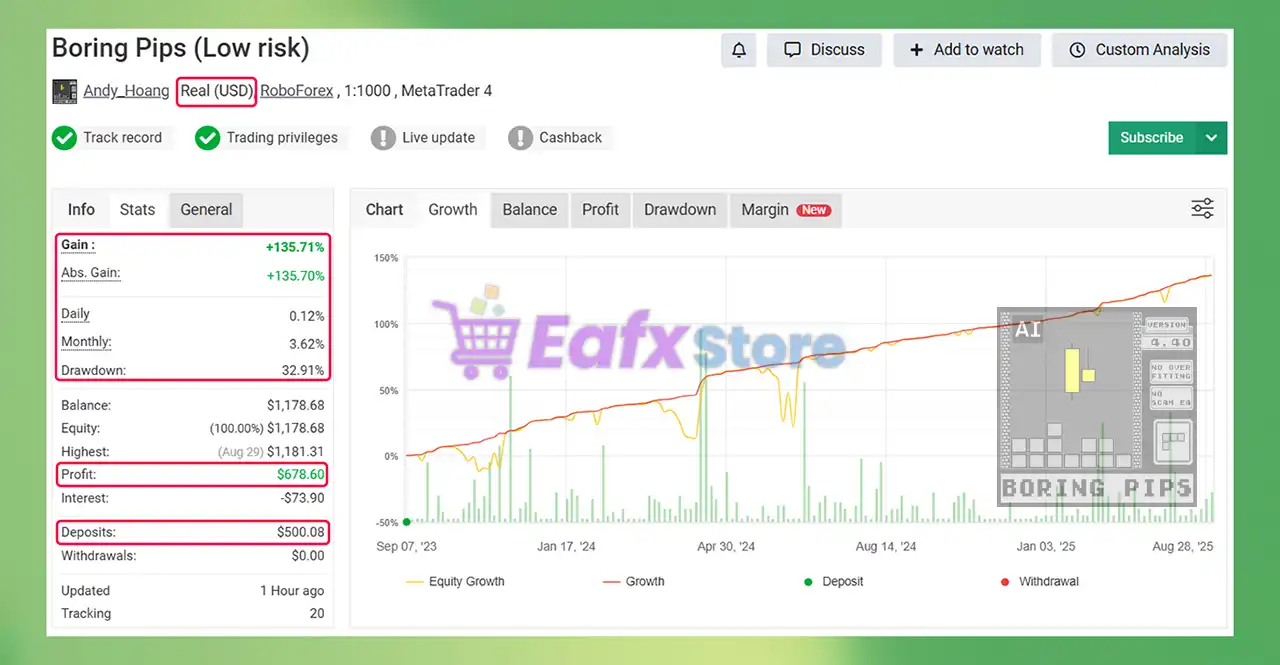 🔹Boring Pips profit performance Verified by Myfxbook for 2 Years (2023 – 2025) shows outstanding profit and steady growth. Try using a Low-Risk strategy with an initial deposit of $500.