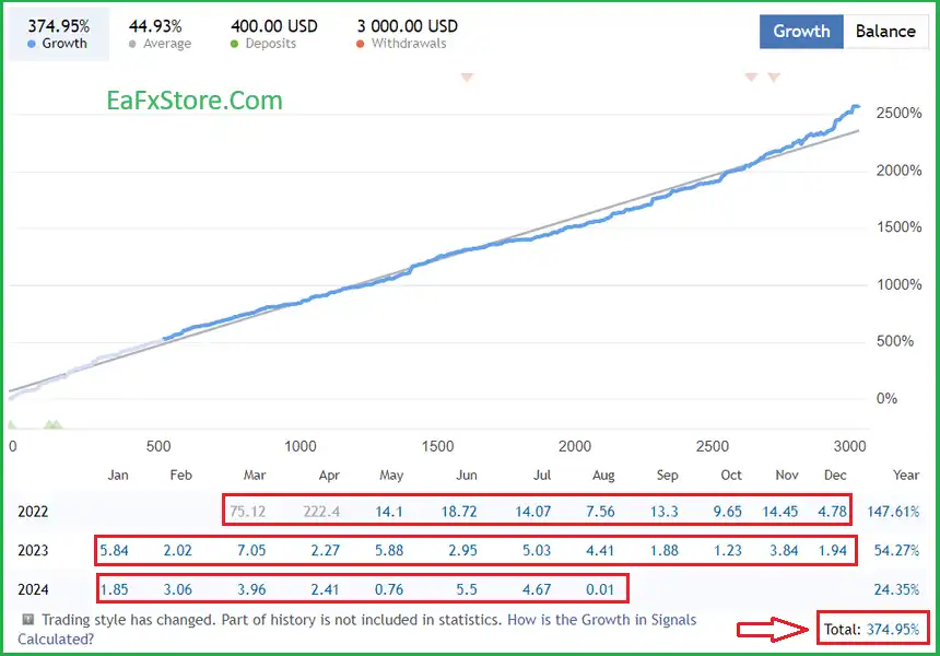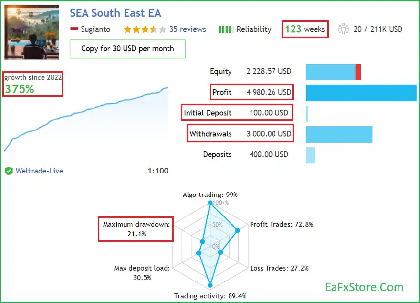 South East EA has demonstrated exceptional trading performance on a real account, starting with an initial deposit of $100. Over 123 consecutive weeks of trading, the expert advisor achieved an impressive 375% total profit while maintaining a maximum drawdown of just 21.1%. With a win rate of 72.8% across all trades, this EA showcases both consistency and reliability.