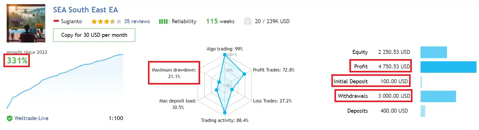 South East EA is an automated trading expert advisor, optimized for forex pairs. Verified profit performance on real accounts and achieved 379% in 144 weeks of trading.