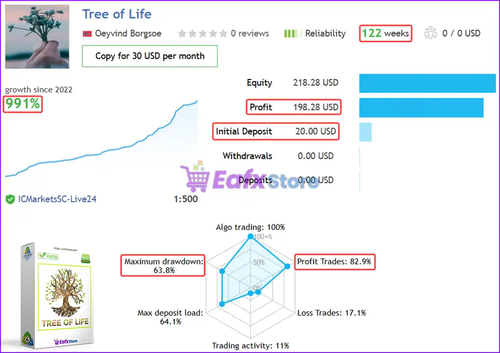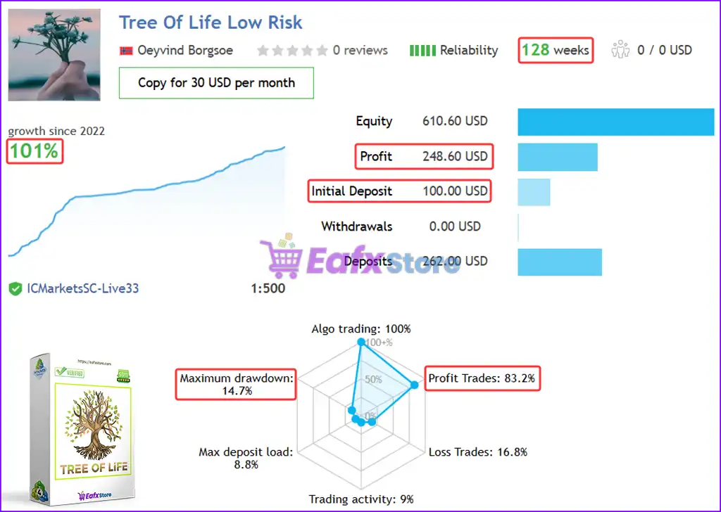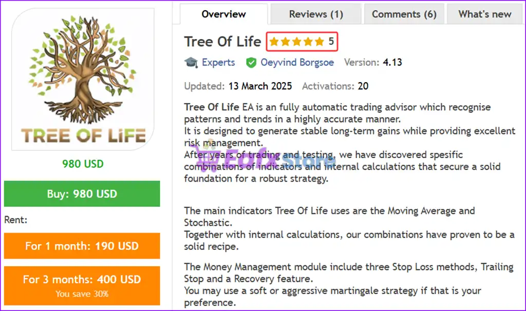 This product is compiled by Oeyvind Borgsoe. This author has more than +2 years of experience working on MQL5 with many famous products such as Tree Of Life EA, Eve EA MT4, Adama MT4 and other advisors. Among them, Tree Of Life EA MT4 is his best performing product.