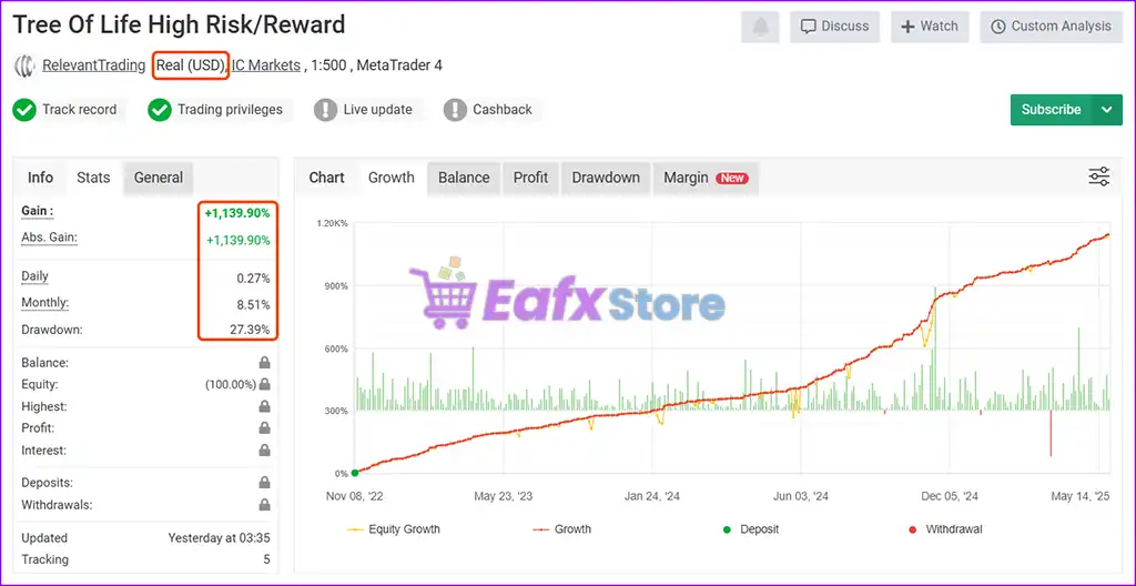 Tree Of Life EA real account performance verified by MyFxBook with 1:500 leverage. This analysis will analyze the key performance metrics, risk management methods, profitability and optimization recommendations for this EA.